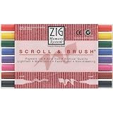 My first Zig markers were the "Writer" ones and it was love at first marker line. I tried to find other types of Zig markers to see what other types of products they had because I loved the "writer" markers so much. I found these and the Calligraphy markers as well. I love these markers just as much as the "writer" ones. They're the same 8 colors as the "writer" and the "calligraphy" ones...but I'm actually pretty happy with that because that means I can have the same color while using a variety of the markers for different techniques and what not. I didn't know what to expect since it wasn't like I could SEE them before buying them, but when I got them in the mail I couldn't wait to play with them. I am very happy with these markers. The brush tip is better than I expected (However, I am definitely NOT an expert) and even though I had never used a "scroll" marker before love playing around with that one too. The caps on all the markers can stack on each other and have plastic lines on the caps to prevent it from rolling across the desk.