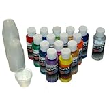 I haven't used these paints yet. This set comes with 14 colors, a bottle of cleaner and a lot of small paint pots. I started using Createx because acrylics were too thick and blocked up my airbrush. The Createx paints are smooth, thin, have good color and cover well. They work well on metal, plastic and airbrushing t-shirts. I have a Pasche and it seems to be really sensitive to the type of paint you use. I would definitely recommend Createx to anyone who is serious about airbrushing.
