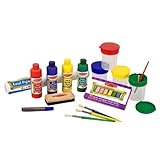 1. This comes with four color coded paint bottles, paint cups, and brushes, and a roll of easel paper. One negative review complained about the brushes losing hairs and the easel paper being too thin, but I have not experienced those problems. True, you can't let your child saturate the easel paper with paint without having something bleed through onto the dry board underneath. But that is true for any easel paper. This easel paper works just fine.