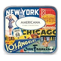 I like the stickers and they do remind me of vintage Americana; however, they are printed on flat paper, not shiny paper as a lot of the originals were. Also, one cannot use them on an adult size vintage suitcase because they are too small. They are more child size or mini stickers. Wish they could have had a little bit more variety, too. All in all, very nice tin, cute stickers!