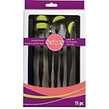 This is a Great set , it's got pretty much everything you need , a Clay Roller , Slicer blade , with handles , 6mm style & detail tool , texture wheel with 2 design whells , a vine and a rope ... a blunt point tool,used to make details in your clay, as well as a blunt clay knife , it's best for cutting a chunk of clay off a bigger peice , so much safer then useing the super slicer , also you can use it to chop the clay up to add two colors together or smooth edges , and a needle end tool , for making lines , small holes to place beads,or smaller bits of clay in for eyes ect , or make fine texture matters and to make holes for beads ..... I got some cheeper tools when i started , this being about 30$ , and they where all plastic and more for kids , or people who use playdoh or softer types of clay .... I wish i had gotten this first and saved my self some fustration , (the roller in my old one was only maybe 4 in long and it hurt my hands where the edges were ) ... a week ago i got a acrylic roller , And i think even with this new kid i will still you the acrylic roller , it's bigger and very sturdy , the one in here dosent seem to be as sturdy , I also had the clay knife in every kit i got got my 6yo child , so i've got about 5 of them , i also got it in my cheeper clay kit , but hey you lose them , or you use one for lighter clay n one for darker ones etc .... But if your starting out in polymer clay world , I say skip the cheeper plastic set and if you have the money go for this , but also invest in a acrylic roller , its just longer and easy to use and very durabal , Just my opinion ! All in all a GREAT product !!!!Cool tools for the price! A really good beginner package. Handy to use and easy to keep clean. Thank you.