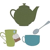 One square die has the two cups (each about 2" by 1") and teabag parts (approx. 1" x 3/4"), and the other die has the teapot (approx. 2"x3")and lid (approx. 1") and spoon (approx. 2").