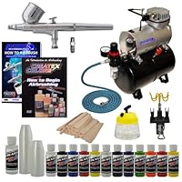 The mixing sticks are like tongue depressors (I break them in 1/2 or 1/4's so they feel more appropriately sized). The paint set included 5 primary colors in the "opaque" line, 6 colors in the transparent line, and a pearlized white. The manual recommends giving a 15 minute rest break for every 10 minutes of use, and the air compressor will get hot after a while, but it will continue operating. Since my main purpose is to airbrush wargaming miniatures and terrain for said miniatures this works for me.